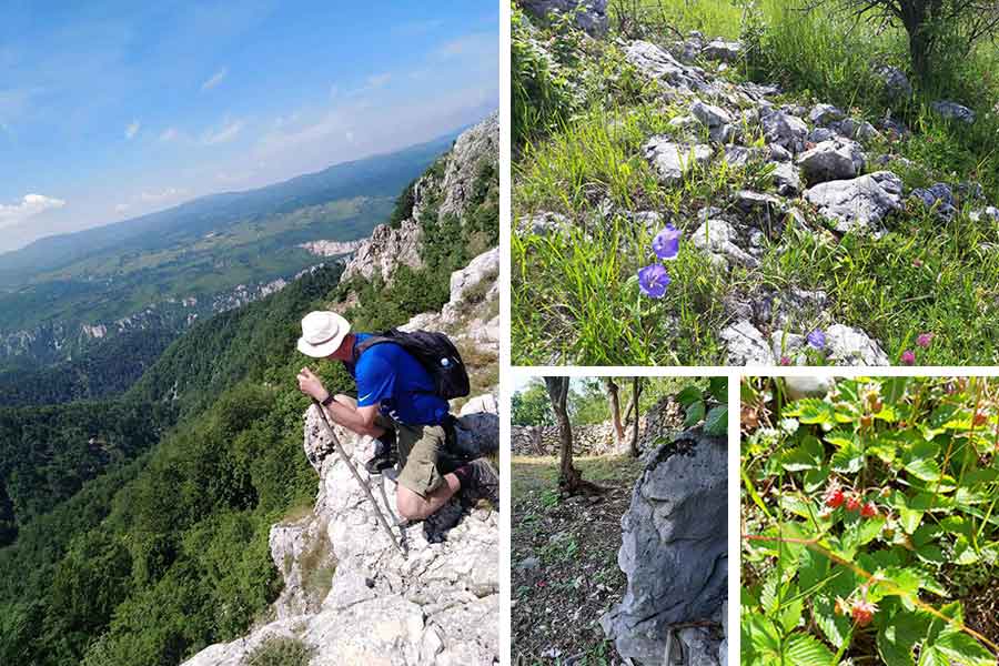 Lazarev kanjon je 20-ak kilometara udaljen od Rtnja, 4 km od sela Zlot, istočna Srbija, naravno. Prvo smo pešačili kroz bukovu šumu, uzbrdo do Velikog i Malog Malinika. Malina nema, ali šumskih jagoda napretek. Zastajemo na svakih par koraka jer svuda su jagodnjaci, kako smo nekada zvali mesta gde su se ušuškale ove lepotice. Uh, kakve su, već sam bio zaboravio da jagode imaju i miris. Onda opet kroz šumu, idemo grebenom do same ivice kanjona. Super su te šetnje, s kamena na kamen, svaki korak novi vidikovac.